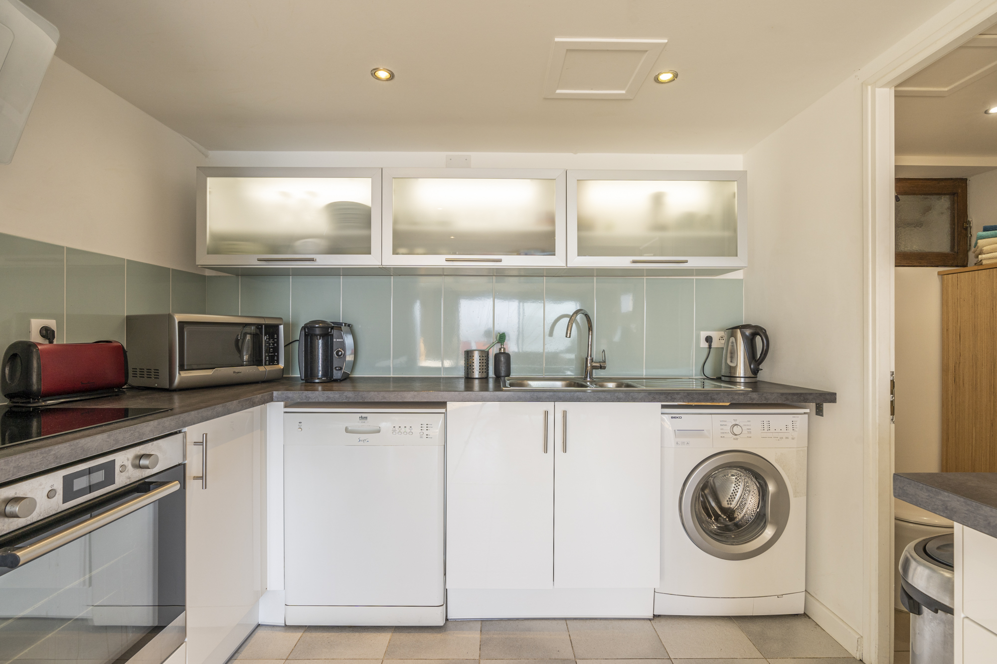 - Cuisine entièrement équipée avec réfrigérateur, congélateur, lave-linge, lave-vaisselle, four, micro-ondes et machine à café Tassimo